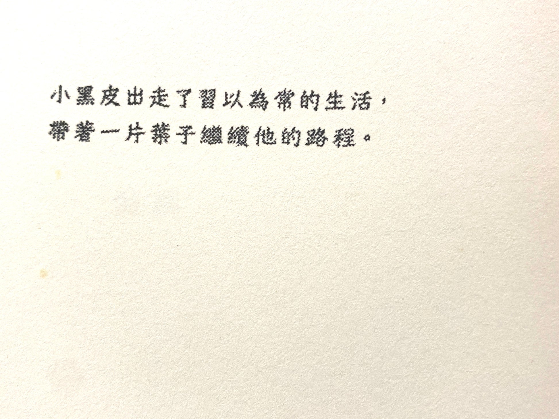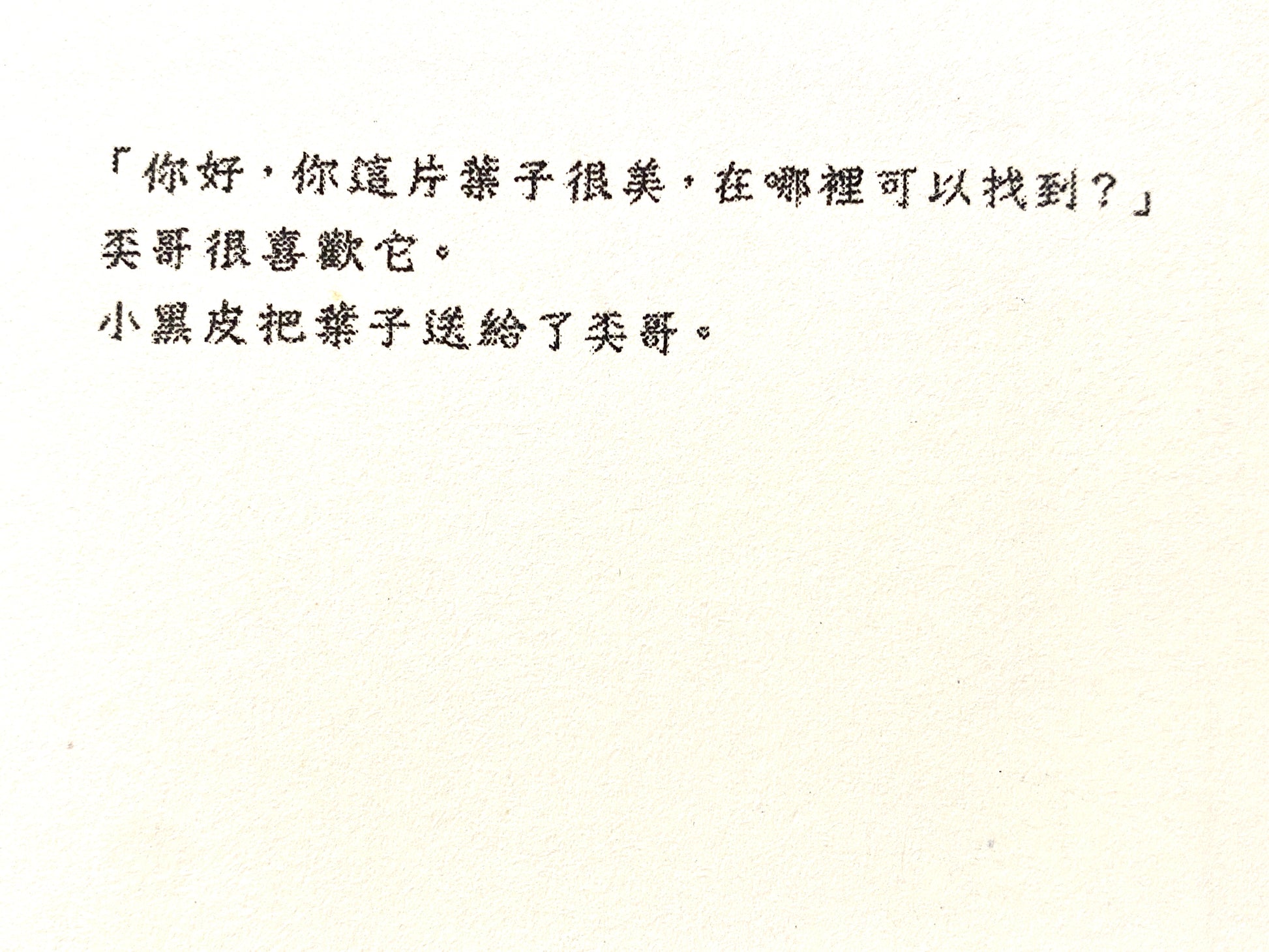 In the story, Xiao Heipi set off with a leaf and met Brother Hu on the road. Brother Hui Yun was attracted by this leaf. He planted this leaf, hoping to see more leaves grow, but the leaf remained the same. But the Mu Shi grew an ordinary surprise. Brother Hu continued his journey with this surprise, and he met another friend who needed to be moved by the ordinary again. The story is not over yet. . . Because readers need to enter the story and continue to maintain curiosity and human touch. In other words, whether the story ends or continues depends on how the reader writes it.