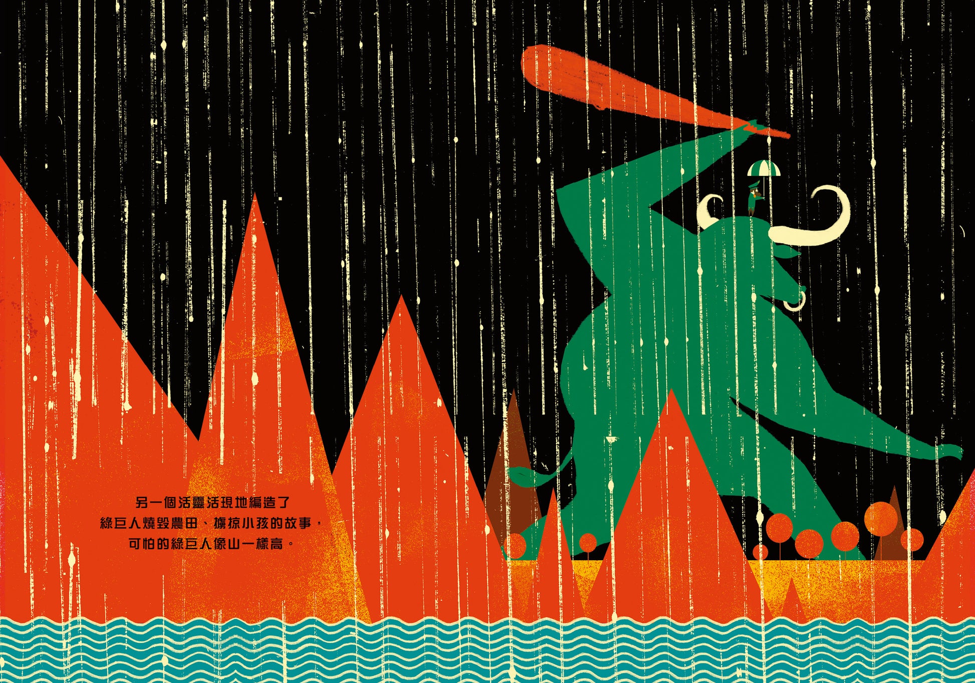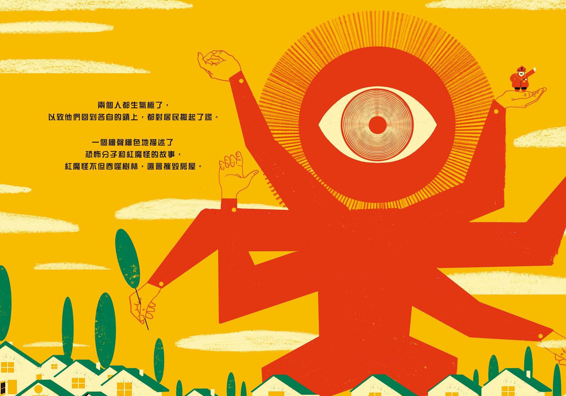 One said: The red monster eats the woods and destroys the houses!