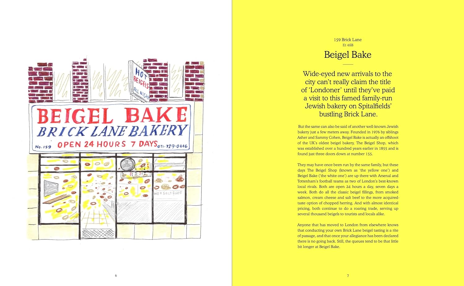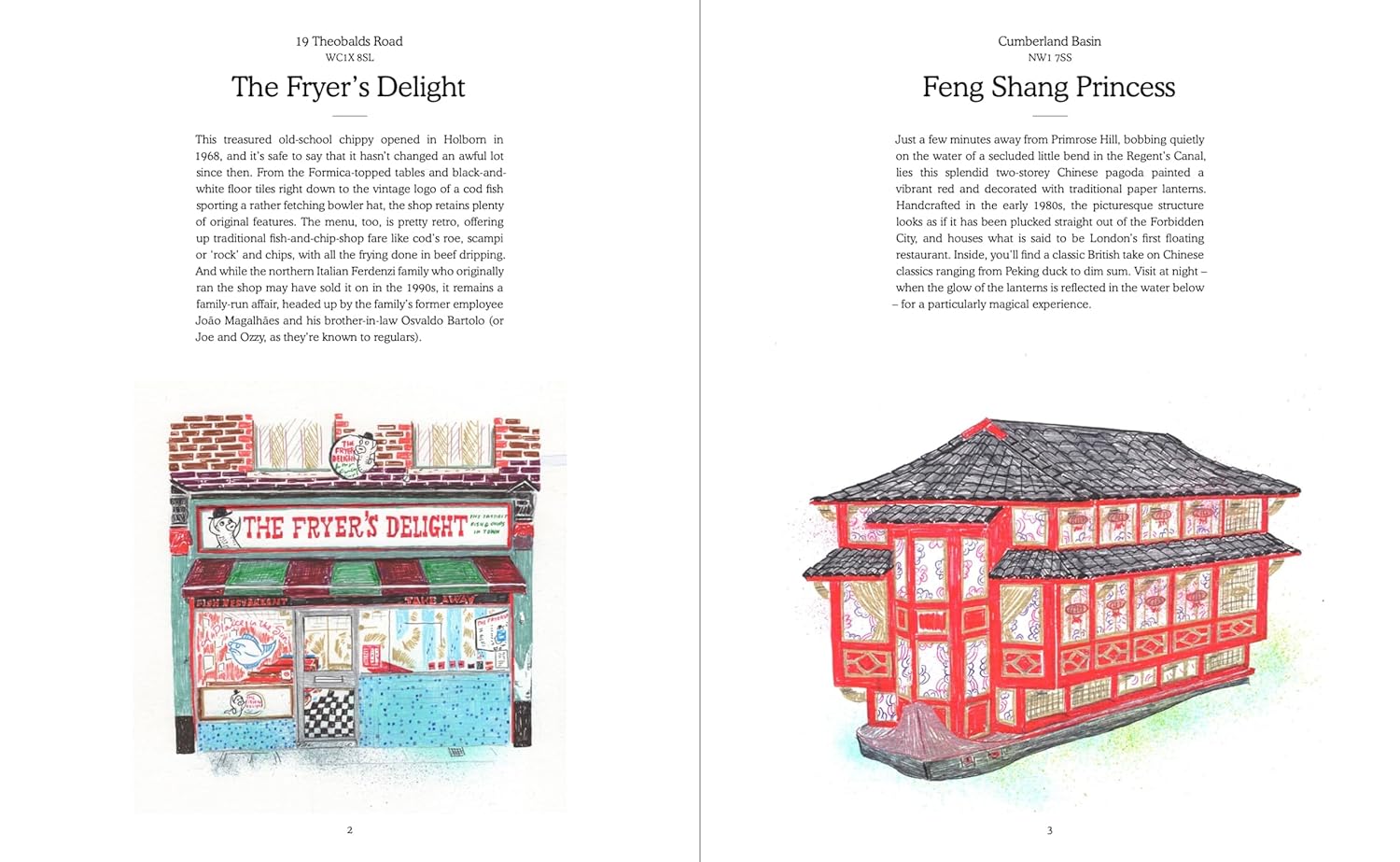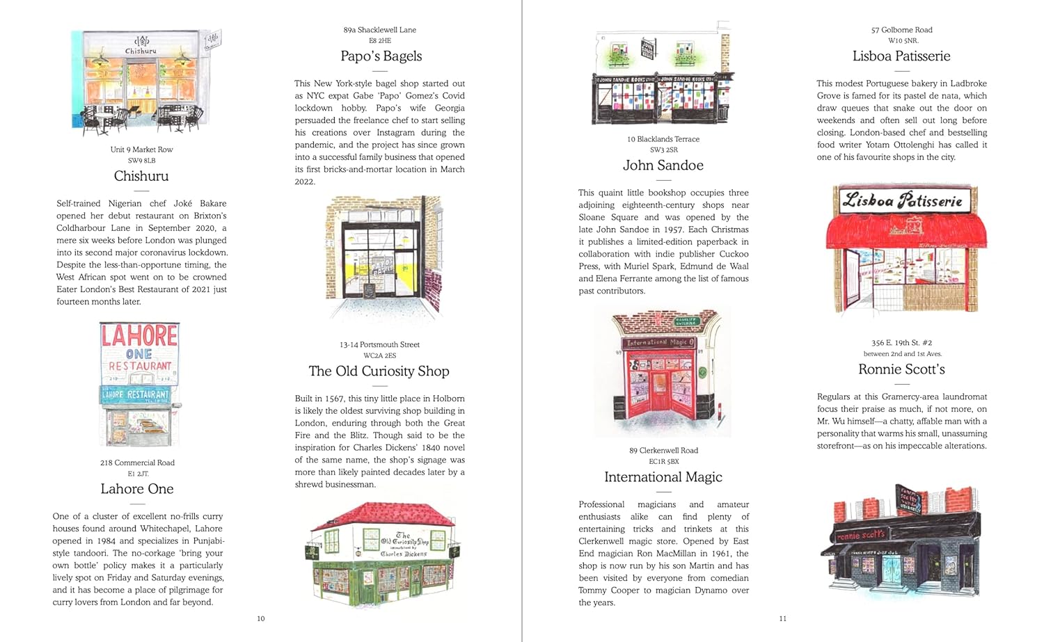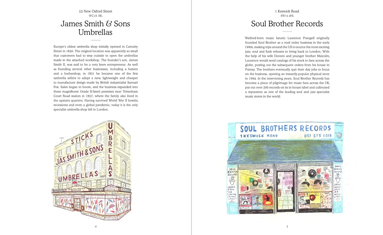 Made with the same energy as NYC Storefronts, this book has a distinctly English vibe. It divides the city into five navigable sections (Central, North, East, South, and West), and highlights its diverse mix of cultures. In each chapter is a sprawling selection of shops, brought to life by Holland’s charming drawings and London-based journalist Rosie Hewitson’s captivating descriptions.