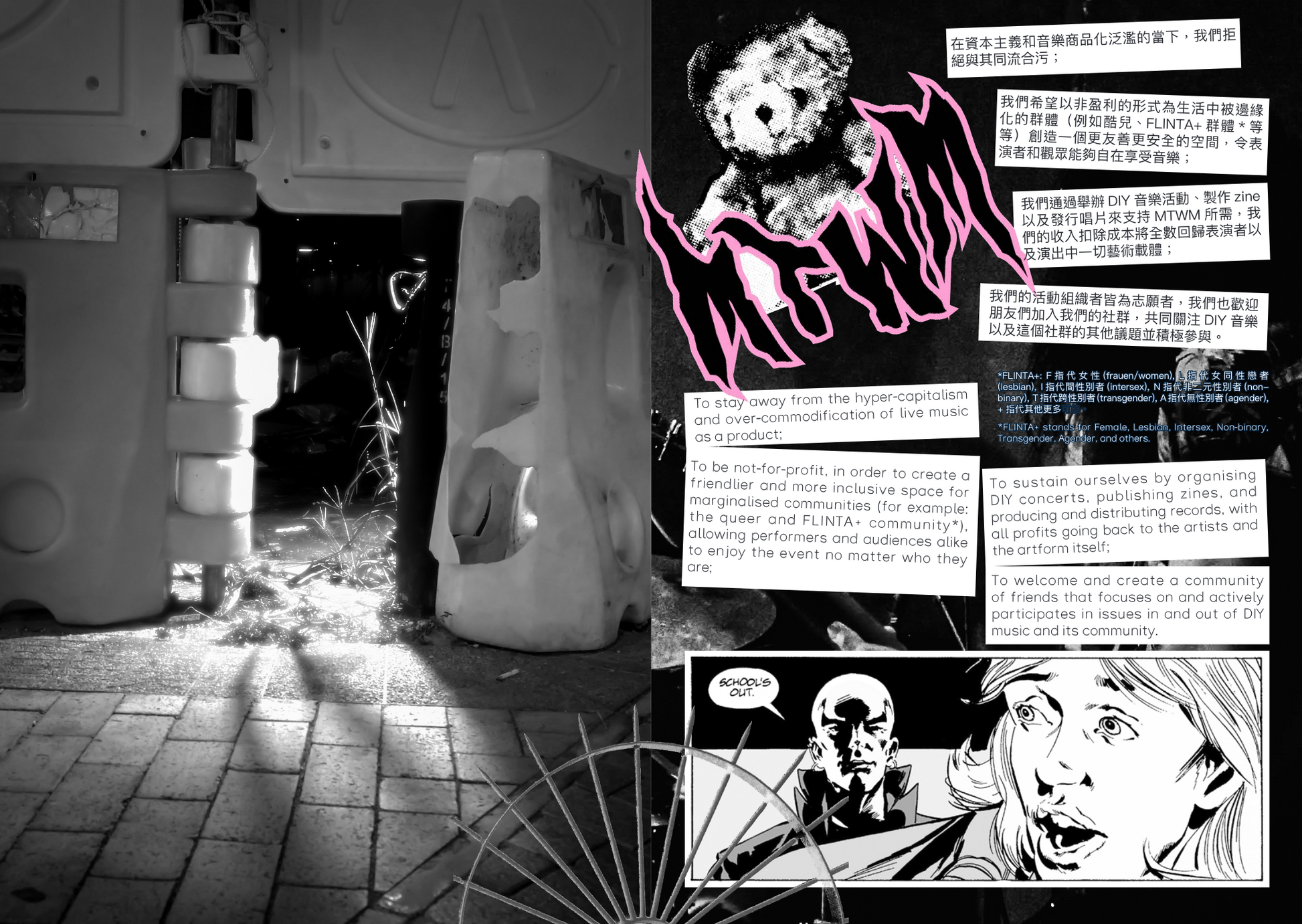 milkteawithoutmilk (MTWM) is a Hong Kong DIY record label founded in 2023. The organisation focuses on organising events, distributing records, and publishing zines, as well as liaising with regional and international promoters for tours and distribution.