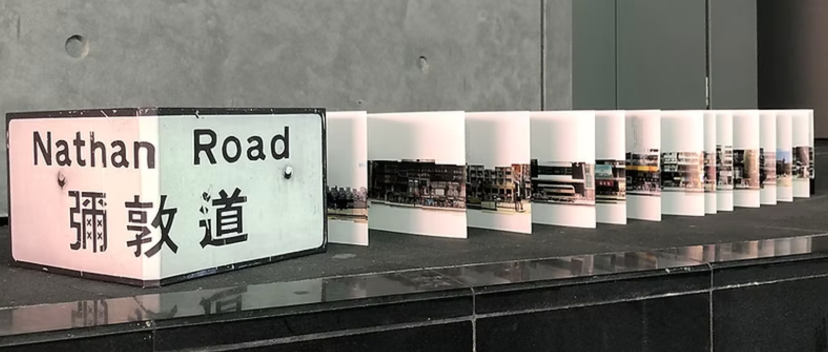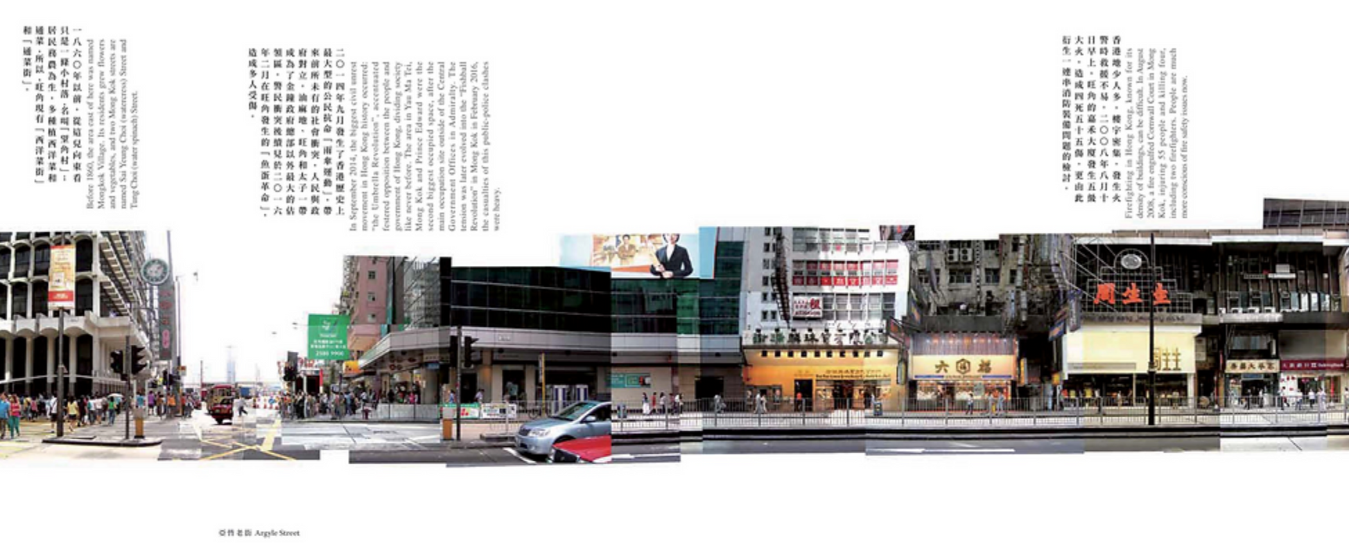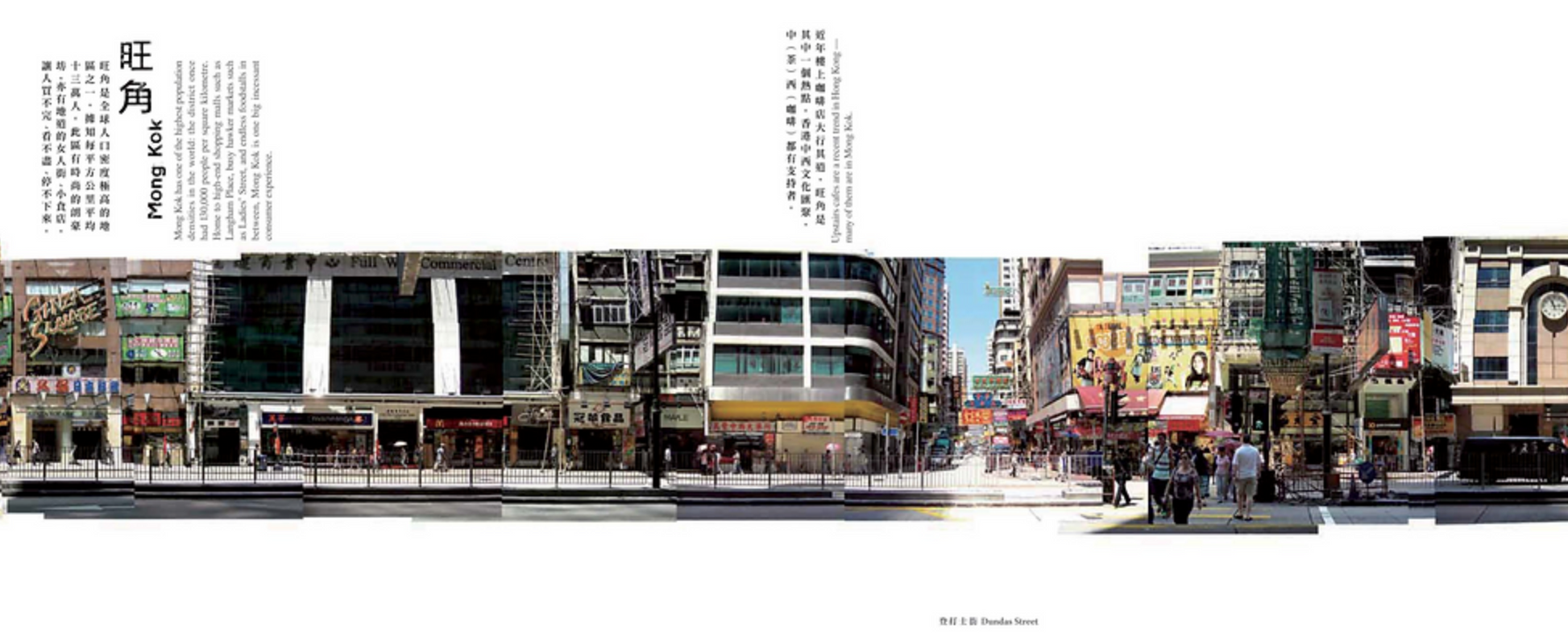 彌敦道自北至南貫穿太子(旺角)和尖沙嘴,沿途包括地標及建築計有半島酒店、重慶大廈、九龍公園、九龍清真寺暨伊斯蘭中心、東英大廈等,是九龍市中心的大動脈。彌敦道上店舖林立,大型廣告牌縱橫交錯,交通車水馬龍,時刻都是熙熙攘攘。盧沛雄鏡頭下的彌敦道全景合成圖像(左右兩邊地舖),既親切又陌生,是長時間等候找拍的成果。