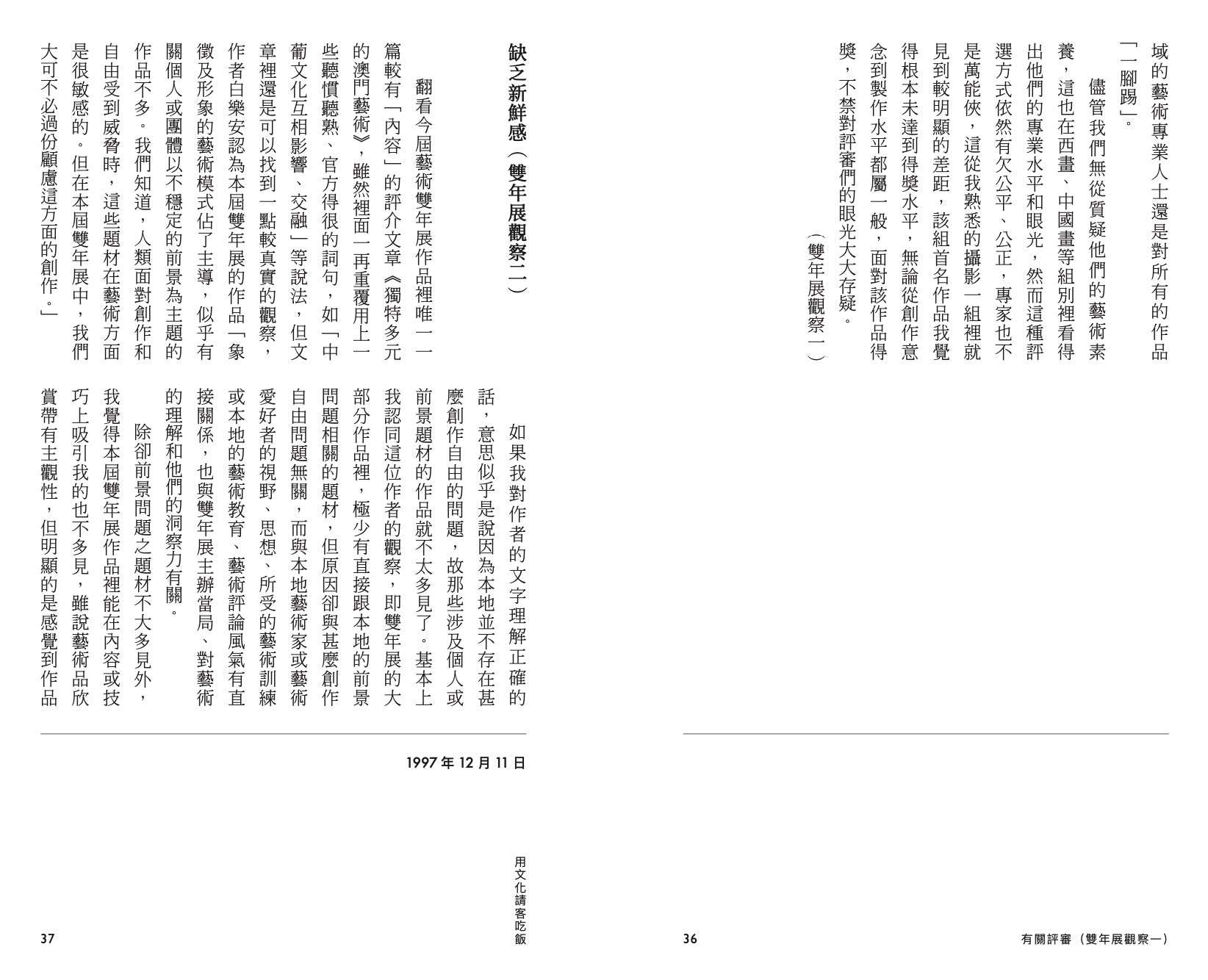 這次選的文章中有部份為回歸前澳門一些較引人關注的文化事件,Frank或為始作俑者,或參與其中,或敲鼓拍和,無論哪一個角色,他以坦率直白之姿以事論事,甚至與權力對峙,這種文化議政的力度,其實是平常不過且自然而然的事,是那個年代文化人的其中一項社會功能,但好像已在看似無事的虛空之處生起了一團野火。
