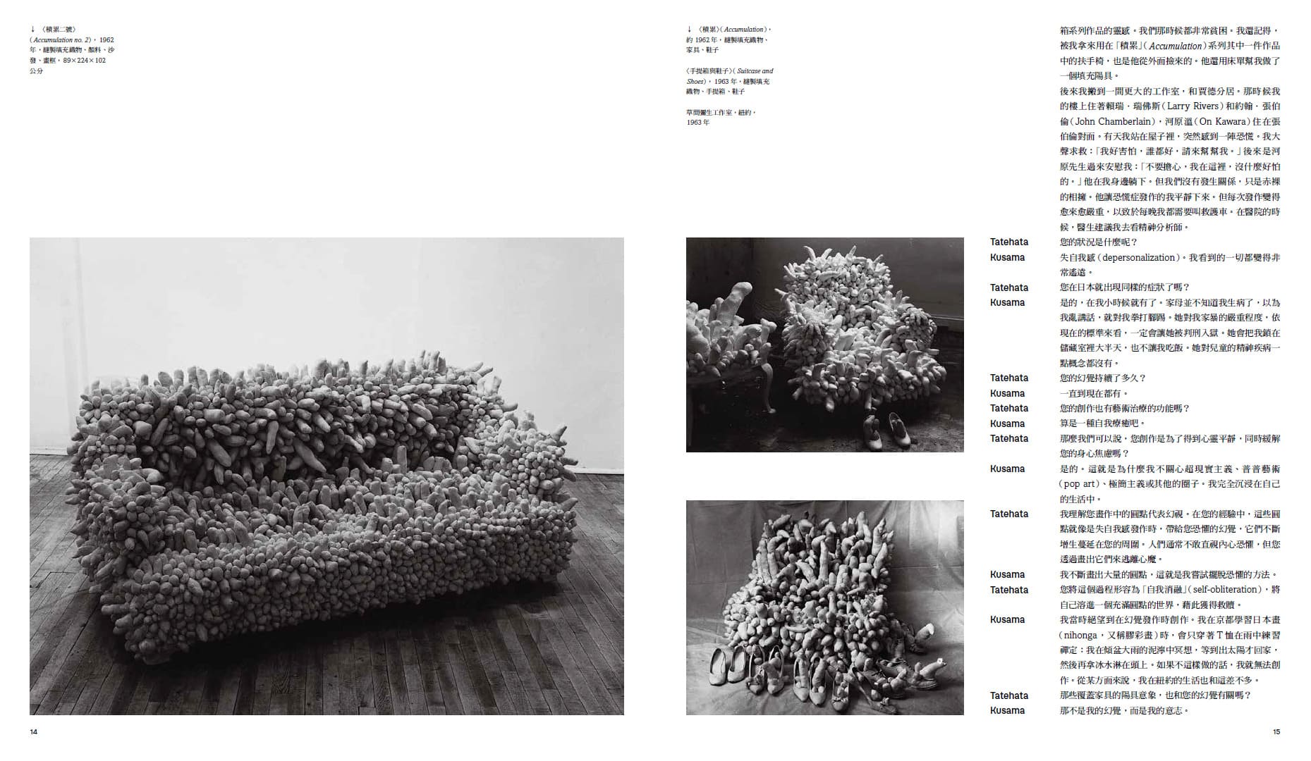 〈訪談〉為草間與大阪國立美術館館長建畠晢的對談,草間自述如何因童年創傷及幻覺經驗走上創作之路,以及早年在紐約艱苦的創作生活;〈概述〉為藝術史學者蘿拉・霍普曼撰寫的專文,以兩萬字篇幅,回顧草間彌生於五零至九零年代的創作軌跡,以草間的重大人生事件,如移居紐約、重返日本為軸,搭配「無限之網」和「積累」系列、〈聚合:千船展〉、〈草間的偷窺秀〉、〈自戀庭園〉、「解剖爆炸」等指標性作品及乍現行動(happening),分析草間的創作動機,呈現草間在不同時期的創作風格及關注面向的流變。
