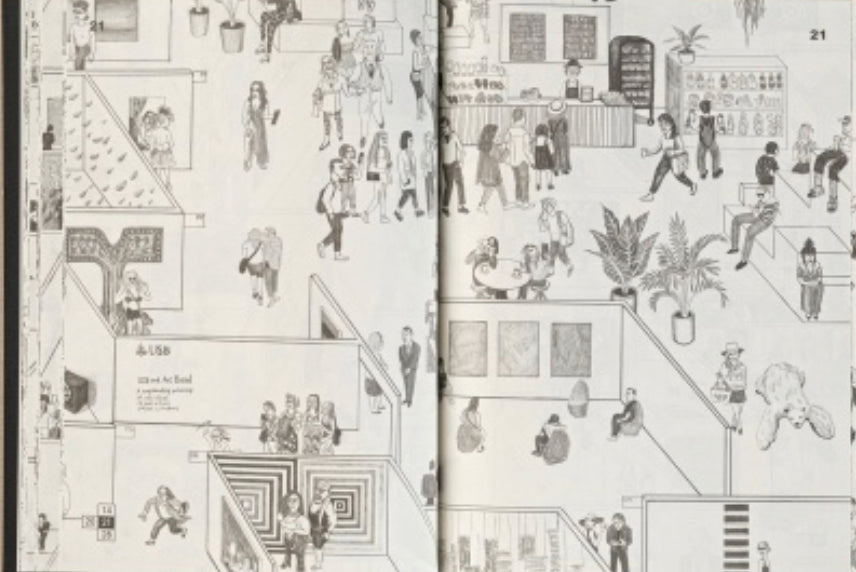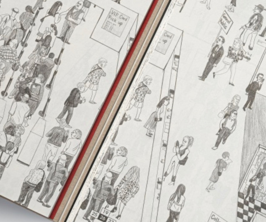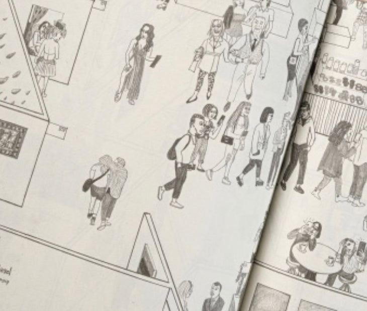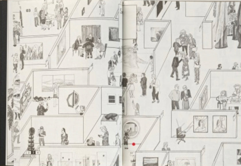 此一畫作原尺寸近5 x 2 公尺,本書的編排依比例切割,分頁如同博覽會地圖,讀者猶如置身其中,穿梭於衣香鬢形的藝術盛會裡,看藝術、看人、看自己。