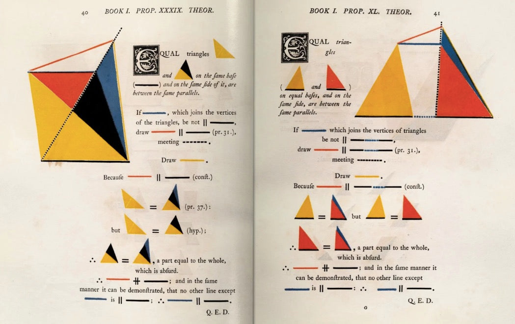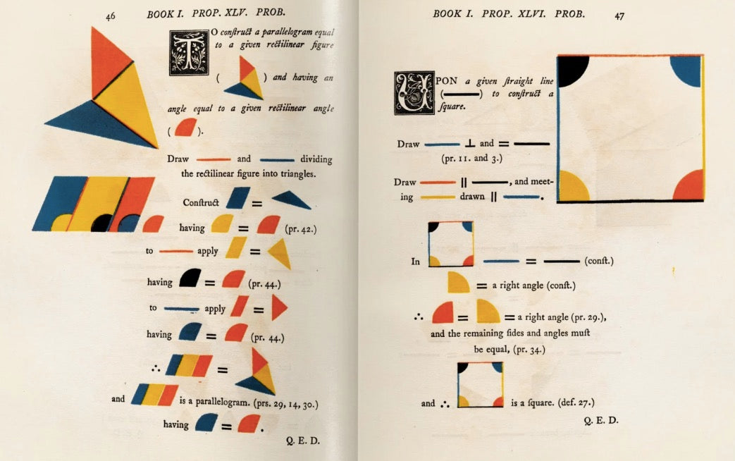 Discover one of the oddest and most beautiful books of the 19th century: Oliver Byrne’s edition of Euclid’s Elements. This work of art and science combines primary colors and mathematical precision in a display of geometric form. Elements anticipates Bauhaus design and even modern info graphics used by news organizations.