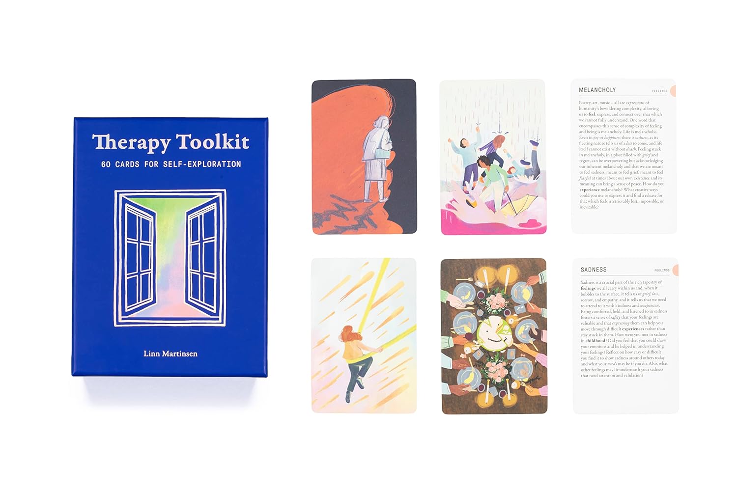 The Therapy Toolbox features sixty cards devised by an experienced and qualified therapist to help the user explore their issues in a compassionate and safe space. Split into four categories - Experiences, Emotions, Relationships and Childhood - each card features questions and reflections that emulate the process of therapy, guiding the user through their journey of self-exploration in order to create deep, meaningful change. It also features a comprehensive booklet, which includes an introduction to the therapeutic process, how to use the deck and further resources. A tool for those who are interested in exploring therapy or companion to therapy itself.